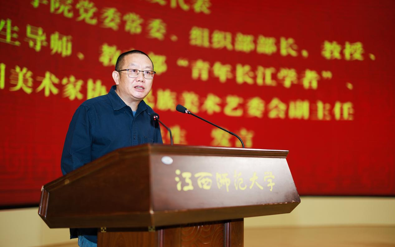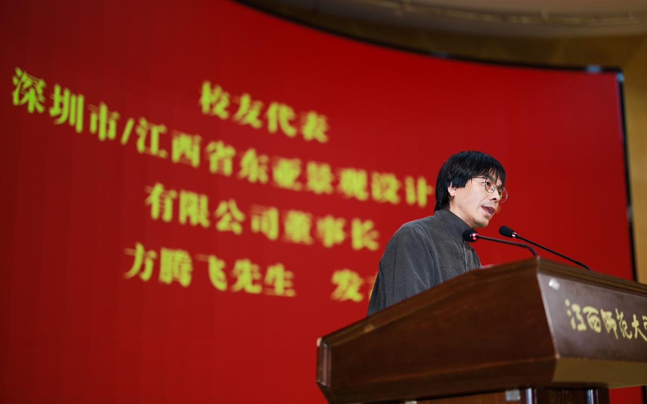 校友代表中国美术学院党委常委、组织部部长,博士生导师,教育部“青年长江学者”,中国美术家协会民族美术艺委会副主任,1995级校友封治国;深圳市/江西省东亚景观设计工程有限公司董事长,2002级校友方腾飞飞先后发言。他们深情回顾了在学院求知求学的点点滴滴,由衷感谢了母校恩师的教诲,表示将继续发扬“静思笃行,持中秉正”校训,秉持“尚美启智 笃行履远”的院校,共同为中国美术事业贡献“师大美院人”的智慧与力量,以实际行动回馈母校的培育之恩。